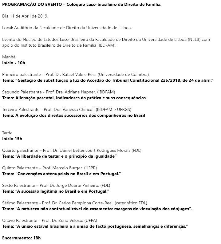 No dia 11 de abril de 2019, o NELB – Núcleo de Estudo Luso-Brasileiro, em parceria com o Instituto Brasileiro de Direito de Família, promove o Colóquio Luso-brasileiro de Direito de Família.
