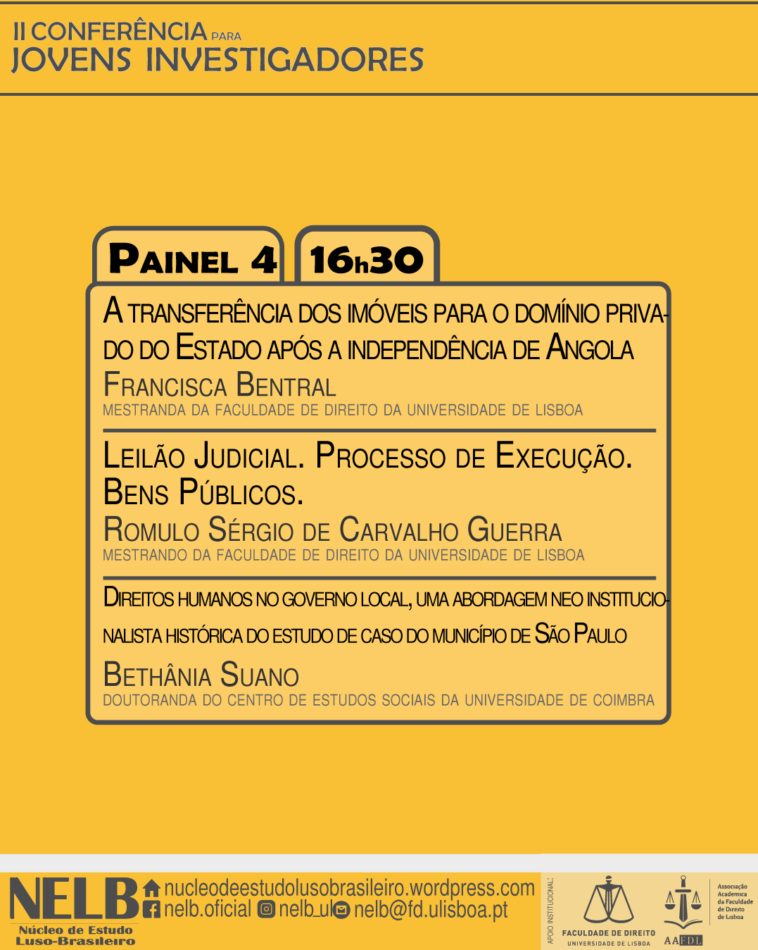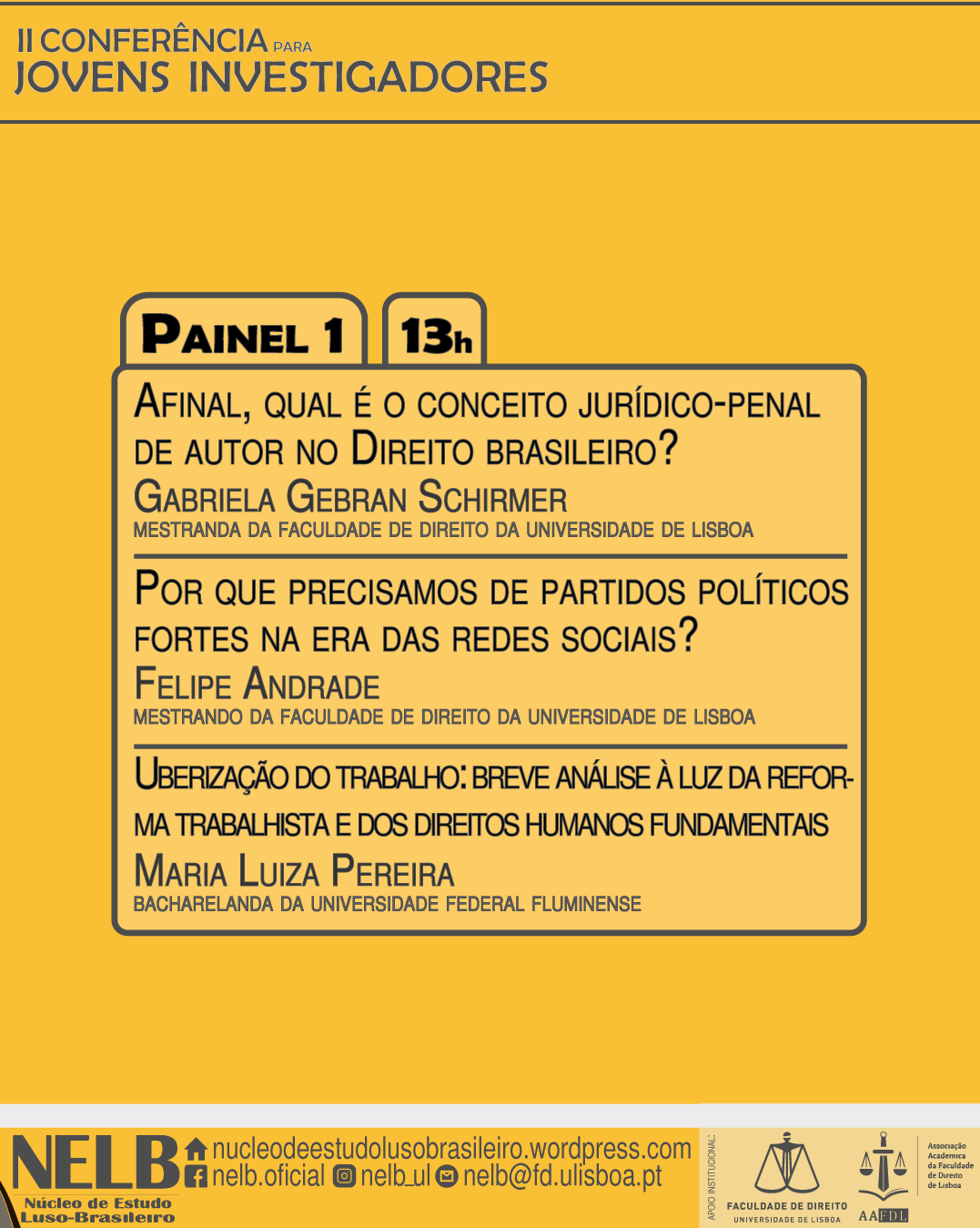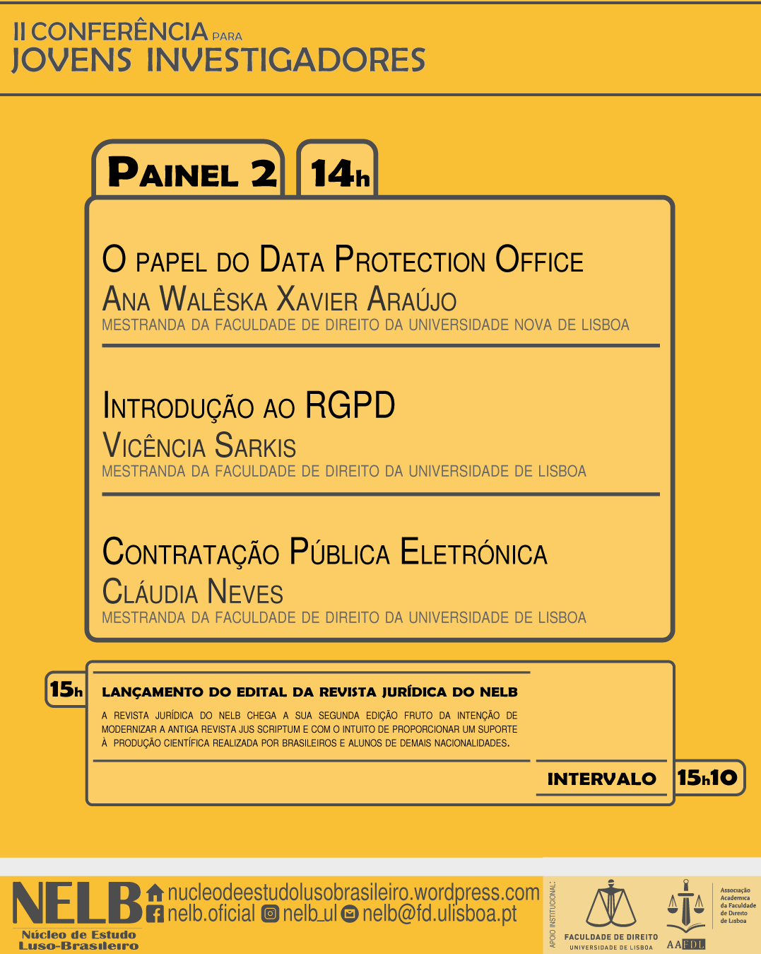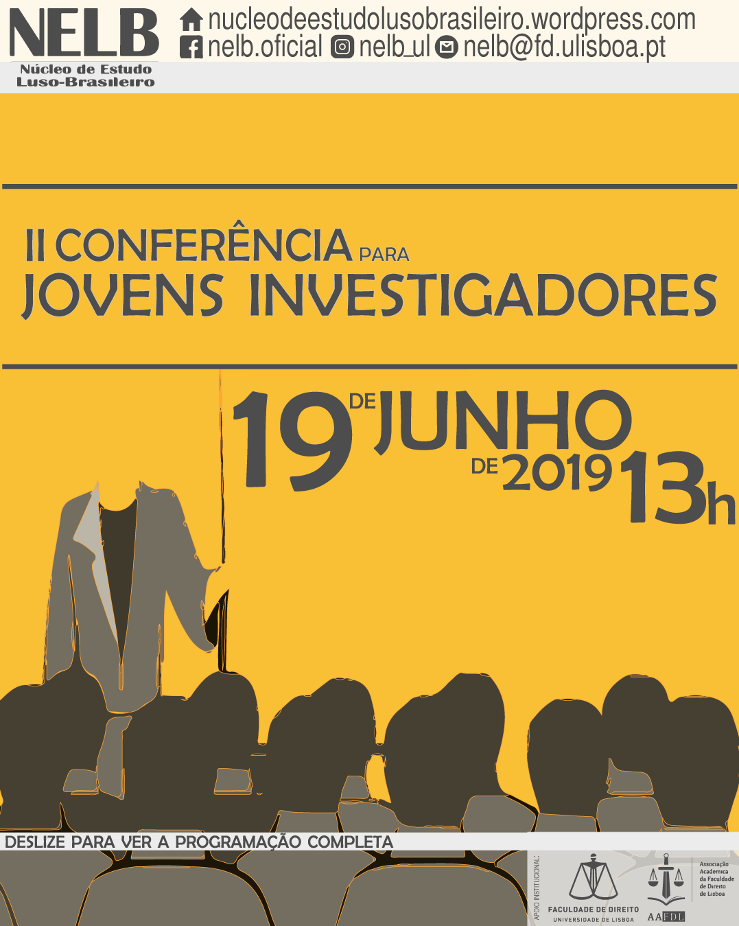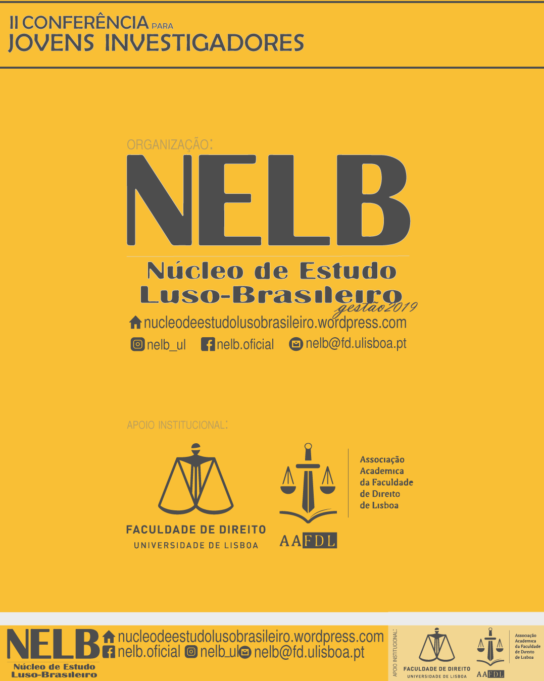 Com o sucesso da conferência do ano passado, no dia 19 de junho de 2019, o NELB – Núcleo de Estudo Luso-Brasileiro realizará a II Conferência para Jovens Investigadores.