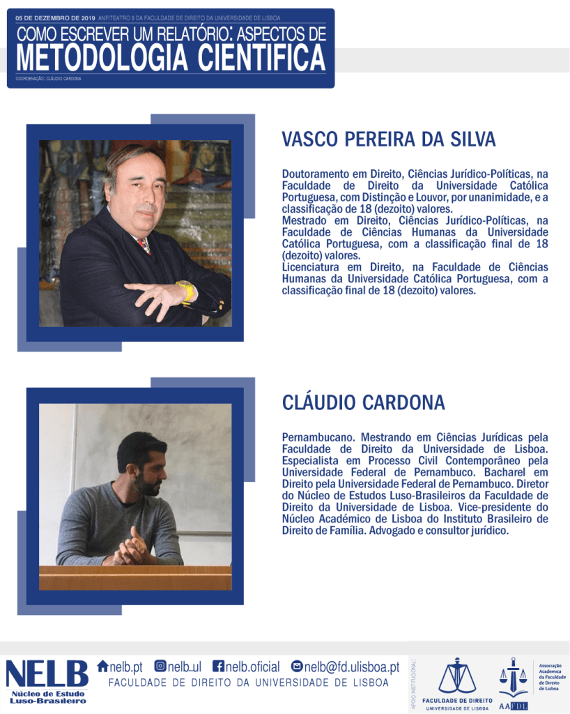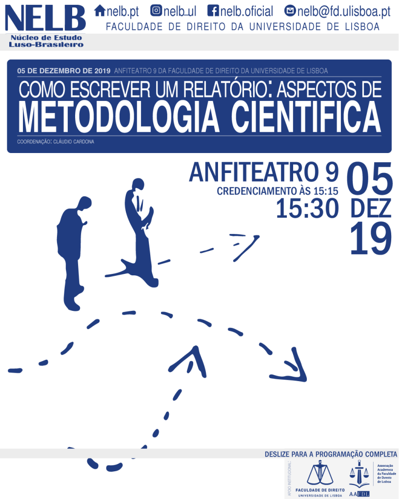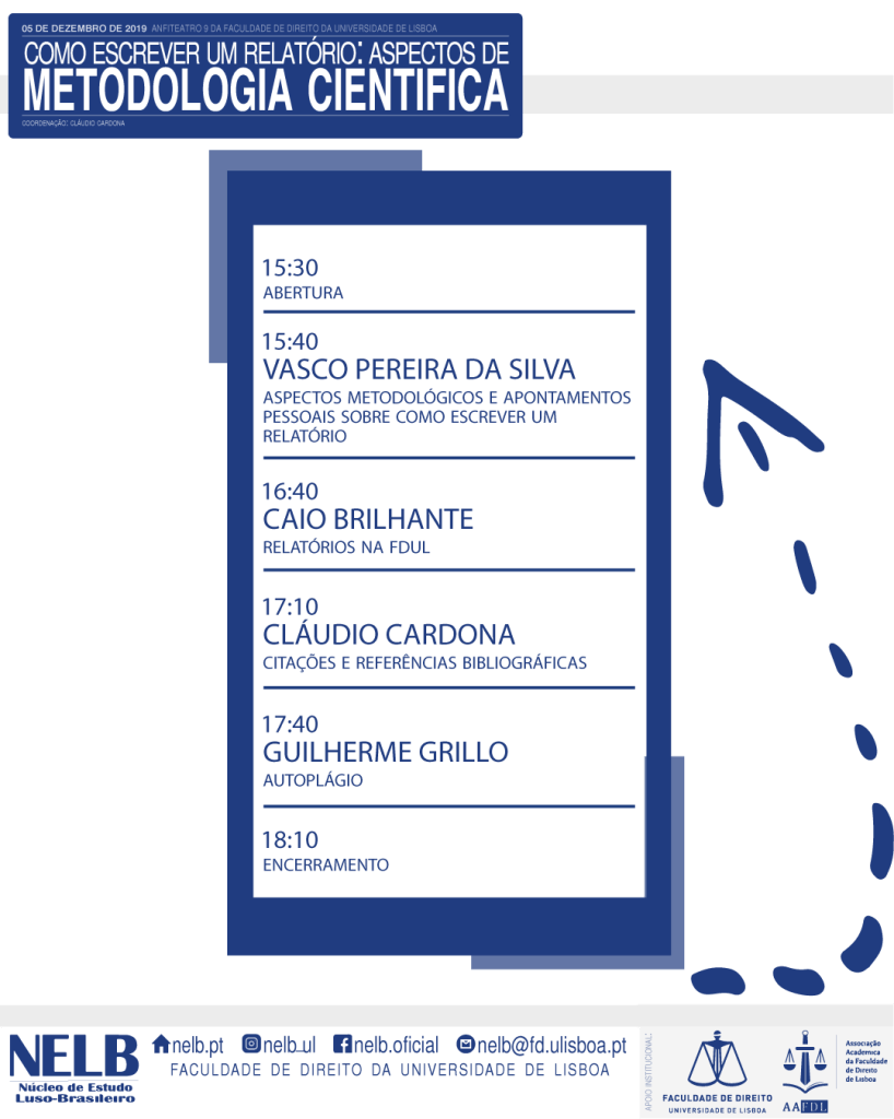 O evento acontecerá no Anfiteatro 4 da Faculdade de Direito da Universidade de Lisboa a partir das 15h30. O credenciamento será feito às 15h15. O objetivo é expor aos discentes do mestrado e doutoramento questões relevantes de metodologia associadas aos relatórios das pós-graduação da FDUL.
