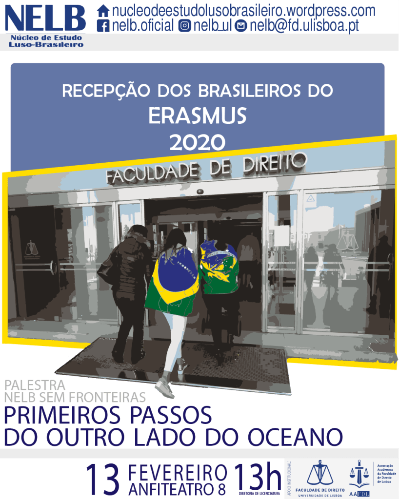 O NELB dá as boas-vindas aos brasileiros Erasmus deste semestre. No dia 13 de fevereiro de 2020, o NELB – Núcleo de Estudo Luso-Brasileiro realiza a tradicional recepção dos alunos do Erasmus. O evento acontecerá no Anfiteatro 8 da Faculdade de Direito da Universidade de Lisboa a partir das 13h, no seguimento logo após às atividades promovidas pelo Gabinete Erasmus e de Relações Internacionais da FDUL.