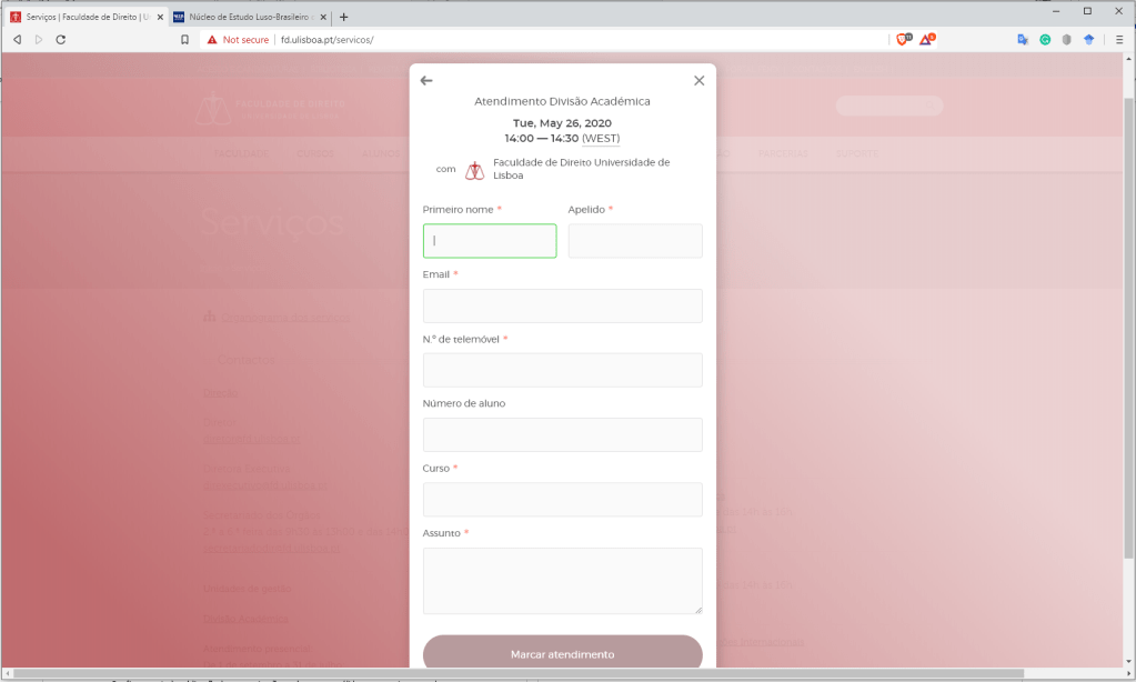 - Aos alunos da Licenciatura e do Mestrado em Prática Jurídica, nas últimas duas semanas foram informados os devidos calendários de exames. As informações relativas aos exames à distância estão disponíveis no site da Faculdade. O NELB está participando como convidado do Grupo de Trabalho para o Acompanhamento da Avaliação a Distância. Estamos à disposição para dar todo o suporte necessário e levar as questões que relevem aos alunos ao conhecimento da Direção da FDUL.