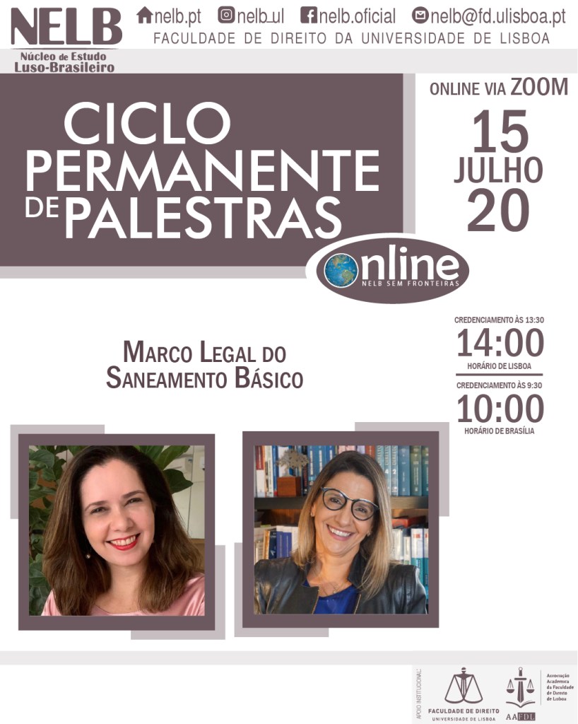 No dia 15 de julho de 2020, o NELB – Núcleo de Estudo Luso-Brasileiro realizará a Conferência sobre o Marco legal do saneamento básico.