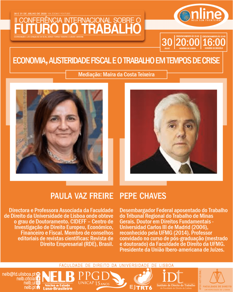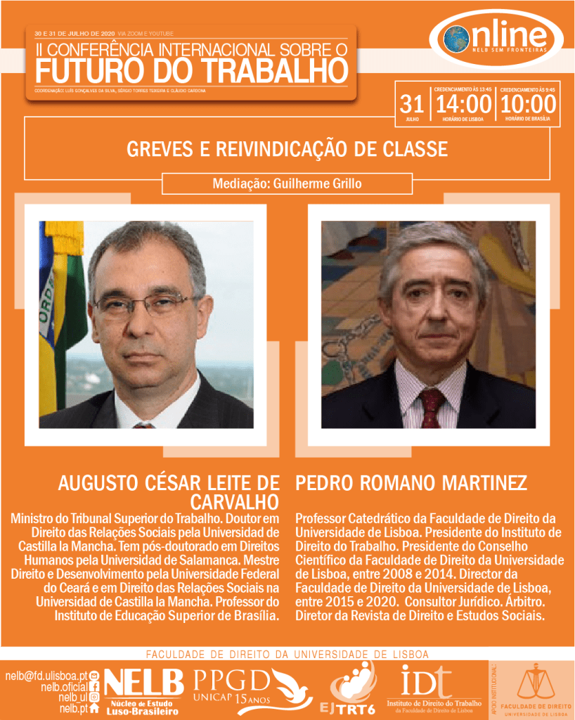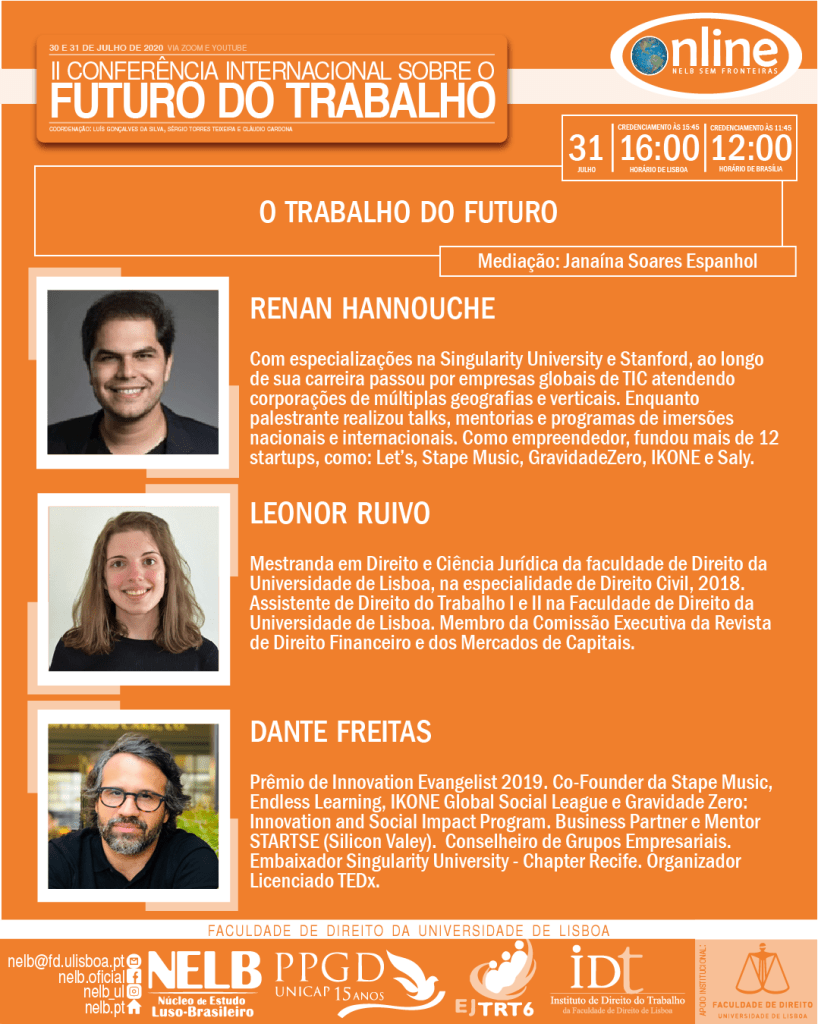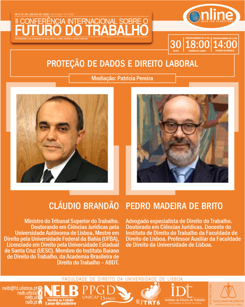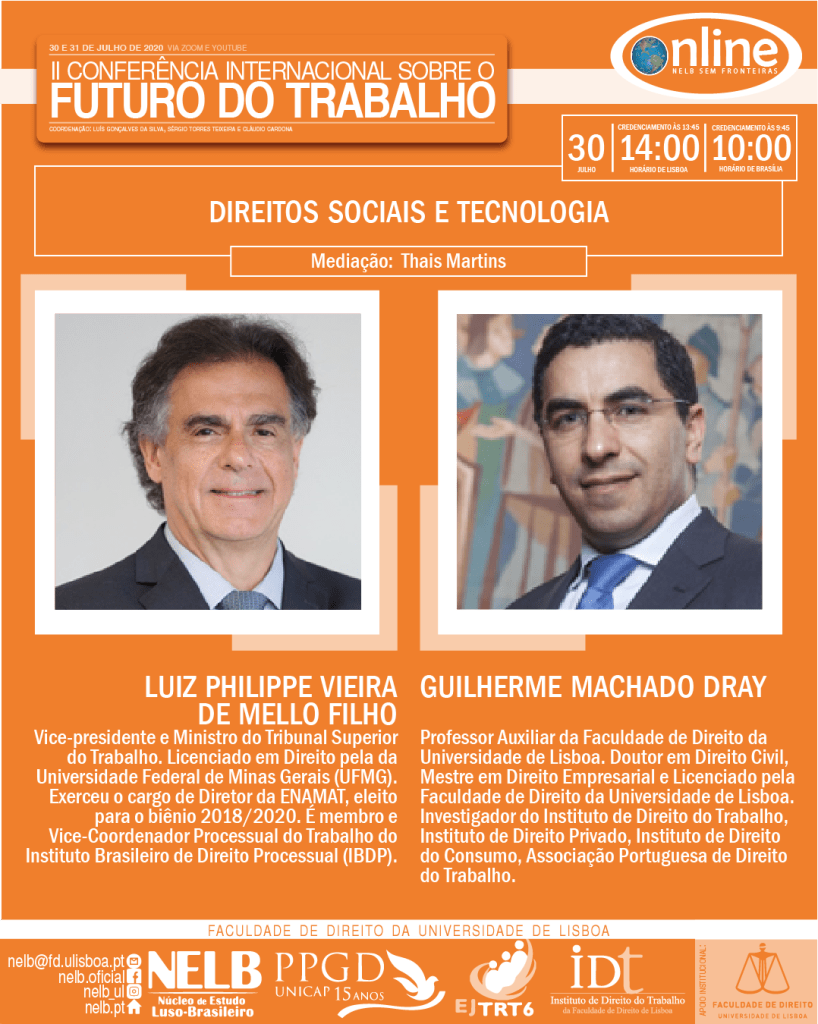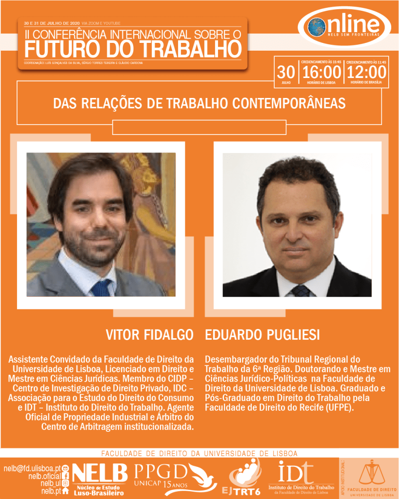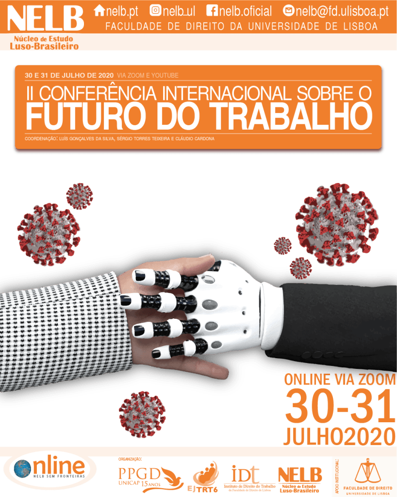 Nos dias 30 e 31 de julho de 2020, ocorrerá a II Conferência Internacional sobre o Futuro do Trabalho, organizada pelo NELB – Núcleo de Estudo Luso-Brasileiro, pelo IDT – Instituto de Direito do Trabalho da Faculdade de Direito da Universidade de Lisboa, pela EJTRT6 – Escola Judicial do Tribunal Regional Federal da 6ª Região e pelo PPGD/Unicap – Programa de Pós-Graduação em Direito da Universidade Católica de Pernambuco.