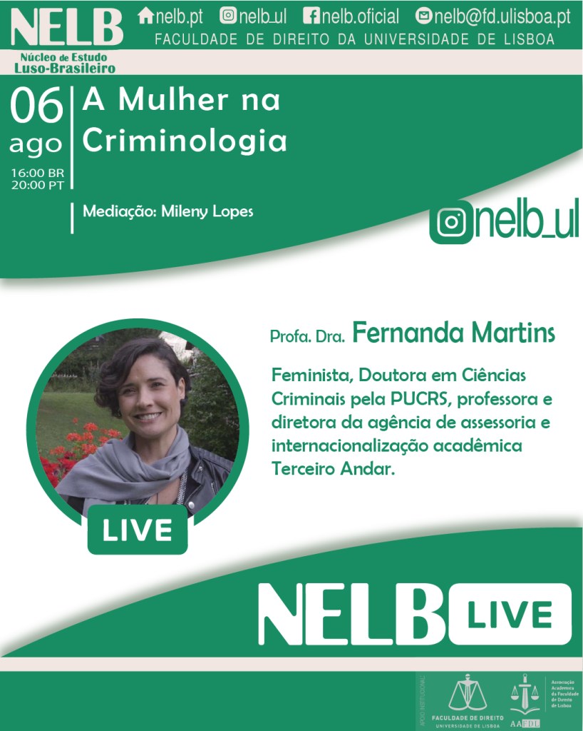 No dia 6 de agosto o NELB- Núcleo de Estudo Lus-Brasileiro realizará uma live em seu perfil no instagram (nelb_ul) sobre o lugar e a vivência feminina na área da criminologia.