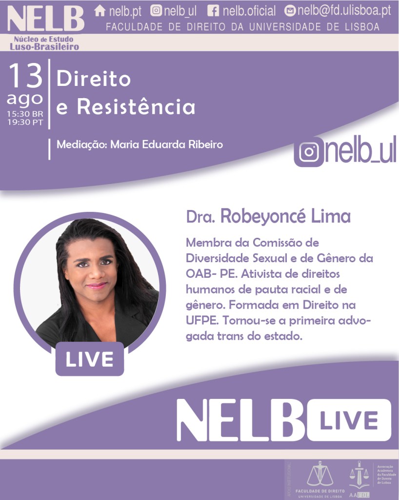 No dia 13 de agosto, o NELB- Núcleo de Estudo Luso-Brasileiro realizará uma live em seu perfil no instagram (nelb_ul) sobre o Direito e Resistência negra, LGBTQIA+, feminina no mundo do Direito.