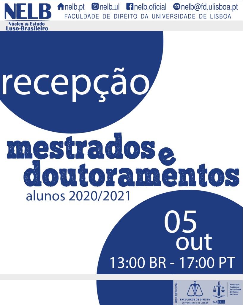 Desta forma, o NELB realiza no dia 05 de outubro de 2020, às 17:00 (Lisboa, e 13:00 em Brasília) a Recepção do Mestrado e Doutoramento 2020/2021. A sessão será via Zoom em razão das contingência sanitárias.