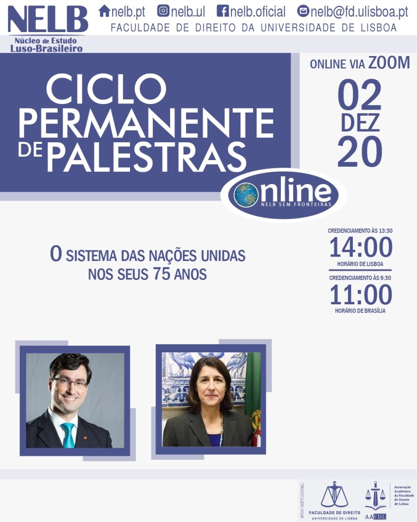 No dia 02 de dezembro de 2020, o NELB – Núcleo de Estudo Luso-Brasileiro realizará a Palestra “O Sistema das Nações Unidas nos seus 75 Anos”.