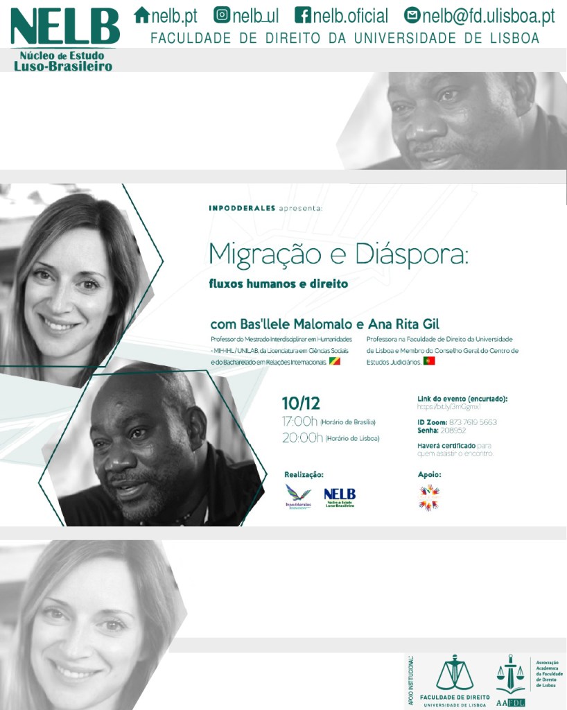 O INPODDERALES (PPGD/UFRJ) em parceria com o NELB (Núcleo de Estudos Luso-Brasileiro – Faculdade de Direito da Universidade de Lisboa) convidam a todas e todos para o Seminário “Migração e Diáspora: fluxos humanos e direito” com a conferência remota dos professores: Ana Rita Gil (Universidade de Lisboa); Bas’llele Malomalo (Universidade da Integração Internacional da Lusofonia Afro-Brasileira – UNILAB) na quinta-feira dia 10 de dezembro às 17:00 h (horário de Brasília) 20:00 h (horário de Lisboa)