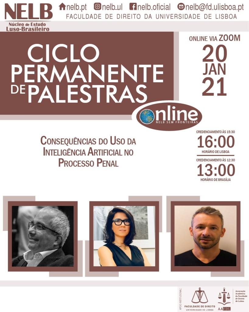 No dia 20 de janeiro de 2021, o NELB – Núcleo de Estudo Luso-Brasileiro realizará o evento “Consequências do Uso da Inteligência Artificial no Processo Penal”.