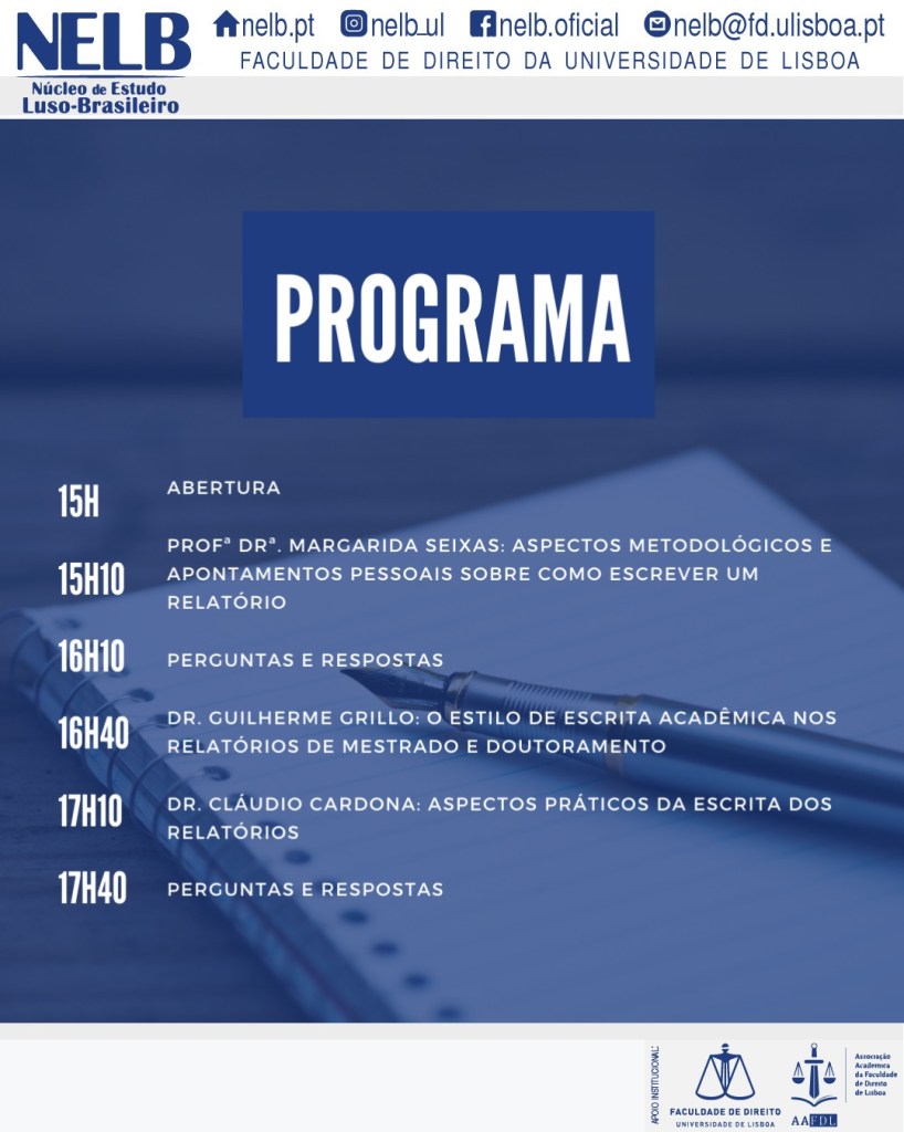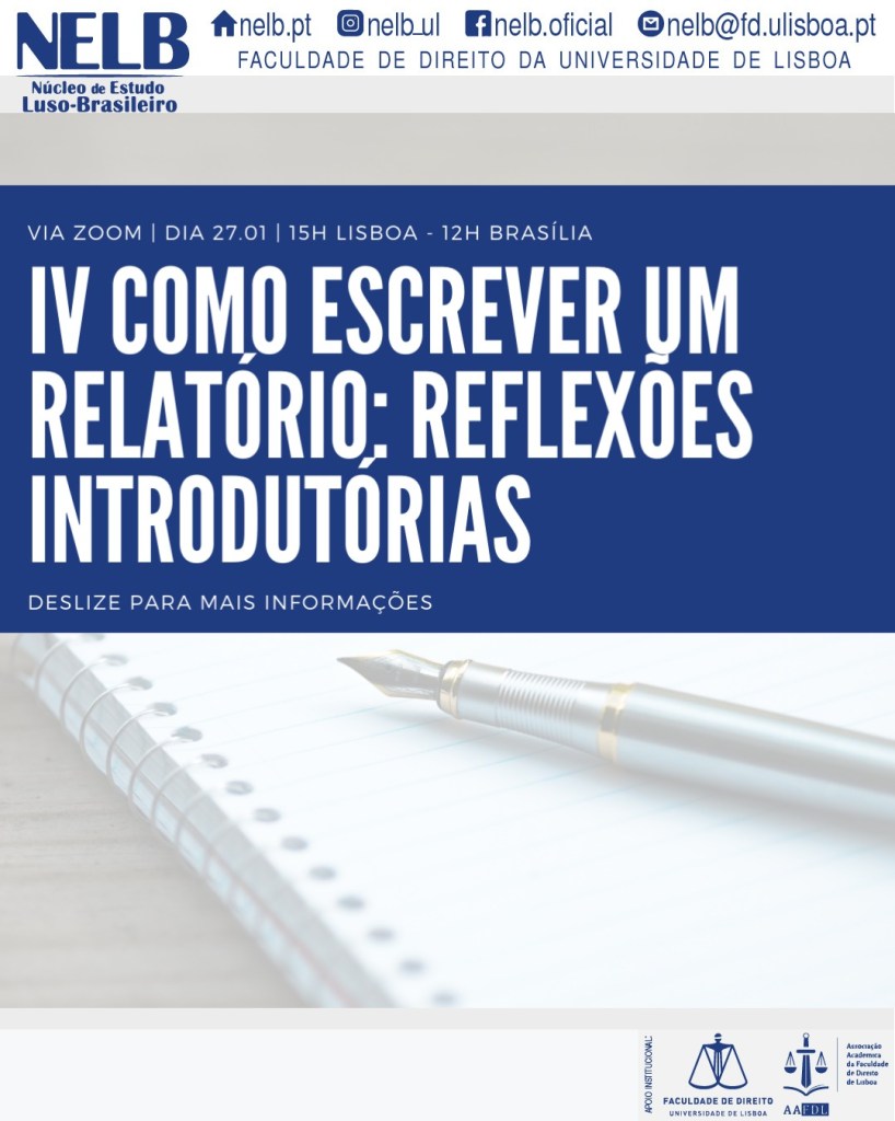 No dia 27 de Janeiro de 2021, o NELB – Núcleo de Estudo Luso-Brasileiro realizará a primeira parte do IV Como Escrever Um Relatório, com a temática de “Reflexões Introdutórias”