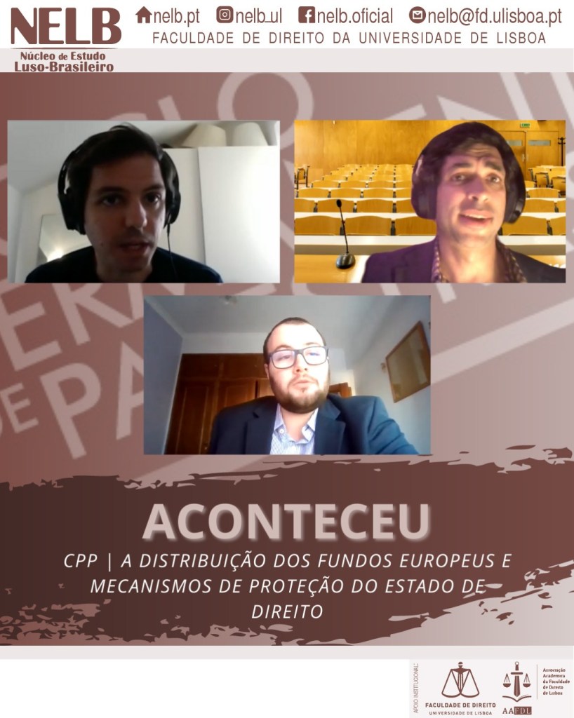 No dia 17 de março de 2021, o NELB – Núcleo de Estudo Luso-Brasileiro realizou o evento “A Distribuição dos Fundos Europeus e Mecanismos de Proteção do Estado de Direito”. O evento faz parte do projeto NELB SEM FRONTEIRAS – CPP Online. Aconteceu via Zoom às 17h, horário de Lisboa (14h, horário de Brasília). . Participarão do evento o Senhor Professor Doutor Francisco Pereira Coutinho e o Dr. Martinho Lucas Pires.