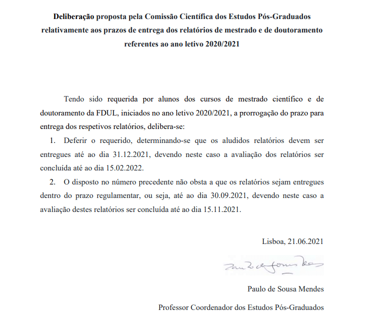 ATUALIZAÇÃO de 02/07/2021: No segmento do que foi informado no post original, o Conselho Científico da FDUL deferiu o pedido de prorrogação do prazo de entrega dos relatórios dos alunos do ano 2020/2021. Essa decisão pode ser consultada aqui. Com isso, o novo prazo de entrega será no dia 31 de dezembro de 2021, o que não obsta a que quem assim desejar possa entregar os mesmos no prazo original (30 de setembro de 2021)
