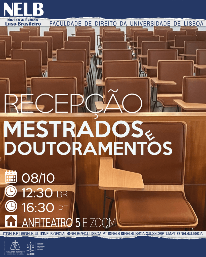 Acontecerá presencialmente no anfiteatro 5 da FDUL e via Zoom a partir das 16h30, horário de Lisboa (12h30, horário de Brasília). O credenciamento será feito às 16h00.