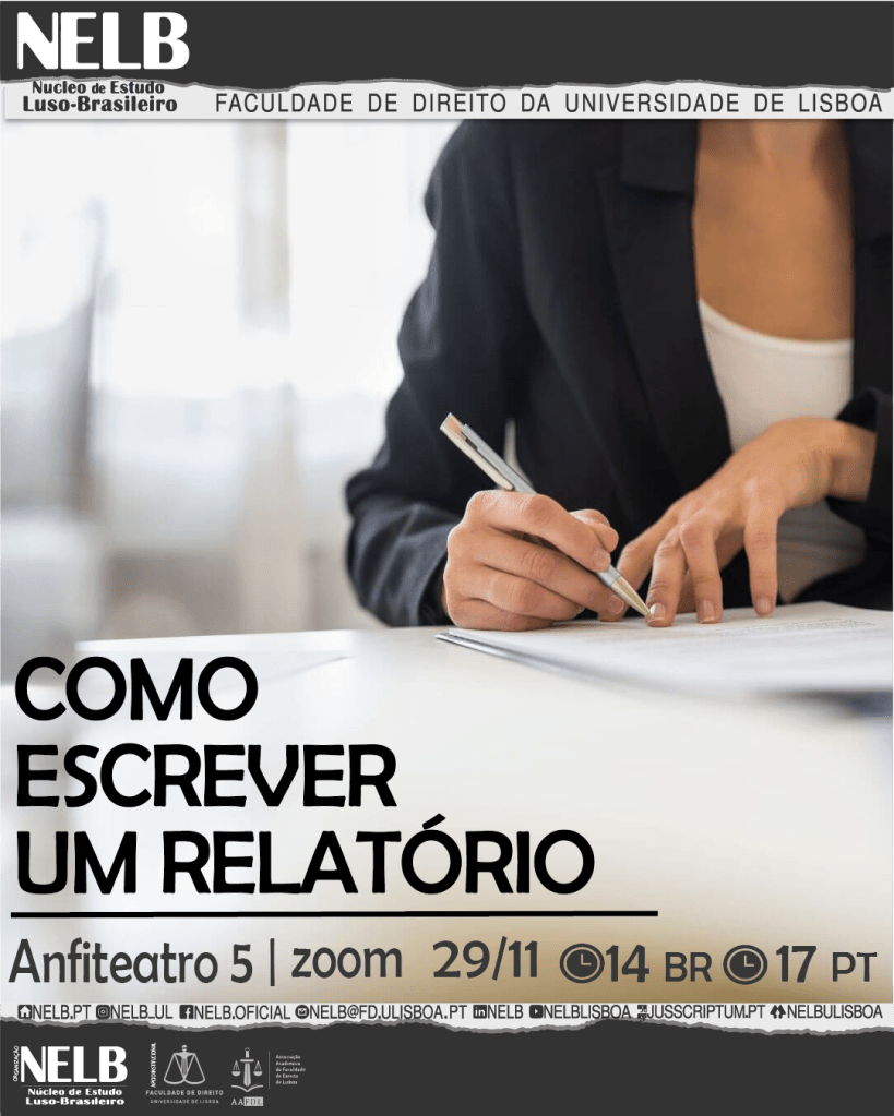 No dia 29 de novembro de 2021, será realizada a sexta edição do Como Escrever um Relatório: Aspectos de Metodologia Jurídica. O evento acontecerá no Anfiteatro 5 na Faculdade de Direito da Universidade de Lisboa e também online via Zoom a partir das 17h (horário de Lisboa) e 14h (horário de Brasília) com credenciamento a ser realizado a partir das 16h45 (horário de Lisboa) e 13h45 (horário de Brasília).