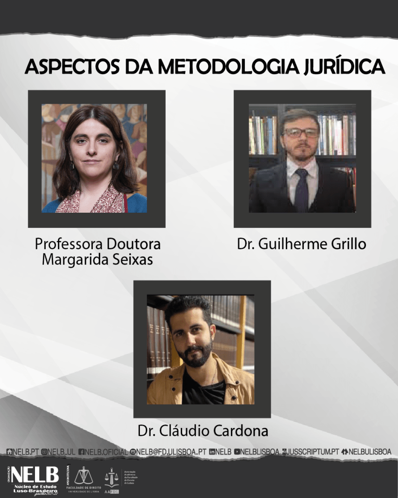 O evento tem o objetivo de auxiliar os mestrandos e doutorandos da FDUL na escrita de seus relatórios do primeiro ano da Pós-Graduação. Para isso, contaremos com a participação do Dr. Cláudio Cardona, Mestrando em Ciências Jurídicas pela Faculdade de Direito da Universidade de Lisboa, Especialista em Processo Civil Contemporâneo pela Universidade Federal de Pernambuco, Bacharel em Direito pela Universidade Federal de Pernambuco, Presidente Interino do Núcleo de Estudos Luso-Brasileiro da Faculdade de Direito da Universidade de Lisboa, Vice-presidente do Núcleo Acadêmico de Lisboa do Instituto Brasileiro de Direito da Família, Advogado e consultor jurídico, juntamente com o Dr. Guilherme Grillo, Doutorando da Faculdade de Direito da Universidade de Lisboa, Investigador do Centro de Investigação de Direito Privado da Faculdade de Direito da Universidade de Lisboa, Mestre em Direito pela Universidade Federal da Bahia, Assistente de investigação da Faculdade de Direito da Universidade de Lisboa e Secretário da Revista da Faculdade de Direito da Universidade de Lisboa, e a Professora Doutora Margarida Pires Seixas, Professora Auxiliar da Faculdade de Direito da Universidade de Lisboa, Doutora em Direito, especialidade Ciências Histórico-Jurídicas, pela Faculdade de Direito da Universidade de Lisboa (2013), Publicou diversos artigos e comunicações sobre o estatuto jurídico da escravidão e as origens do Direito do Trabalho, Investigadora integrada do Centro de Investigação em Teoria e História do Direito da Universidade de Lisboa, membro do Instituto de Estudos de Literatura e Tradição e Centro de Estudos Interculturais do ISCAP, Instituto Politécnico do Porto.