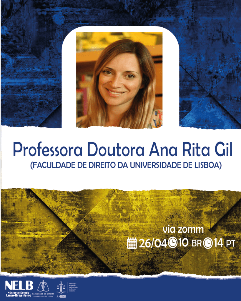 O evento acontecerá via Zoom, a partir das 10:00h, horário de Brasília (14:00h, horário de Lisboa). O evento contará com as ilustres presenças da Prof.ª Doutora Ana Rita Gil (FDL) e da Dr.ª Emellin de Oliveira (NOVA School of Law). Mediação pela Dr.ª Duane Braga (Mestranda FDL)