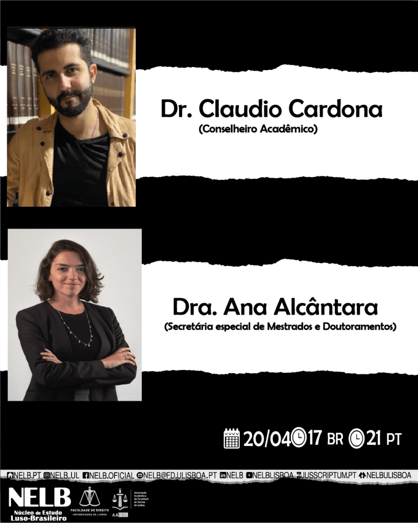 A live ocorrerá às 17h BR| 21h PT e contará com o Dr. Cláudio Cardona, Conselheiro Pedagógico da FDUL e será mediado pela Dra. Ana Alcântara, Vogal de Mestrados e Doutoramentos da AAFDL.