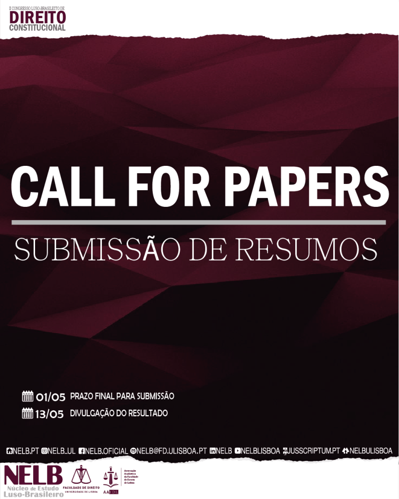 O Núcleo de Estudo Luso-Brasileiro da Faculdade de Direito da Universidade Lisboa (NELB/FDUL) convida professores(as), estudantes, pesquisadores(as) e operadores(as) do Direito e ciências correlatas a encaminharem resumos para apresentação oral no II Congresso Internacional de Direito Constitucional.