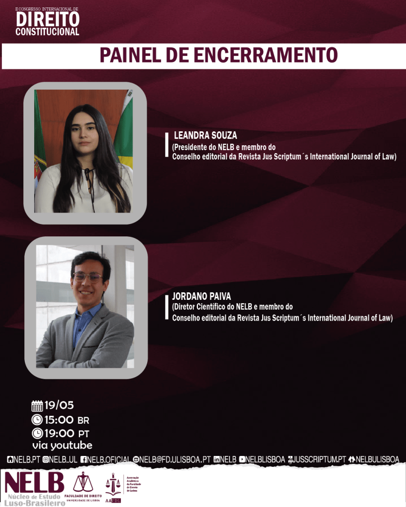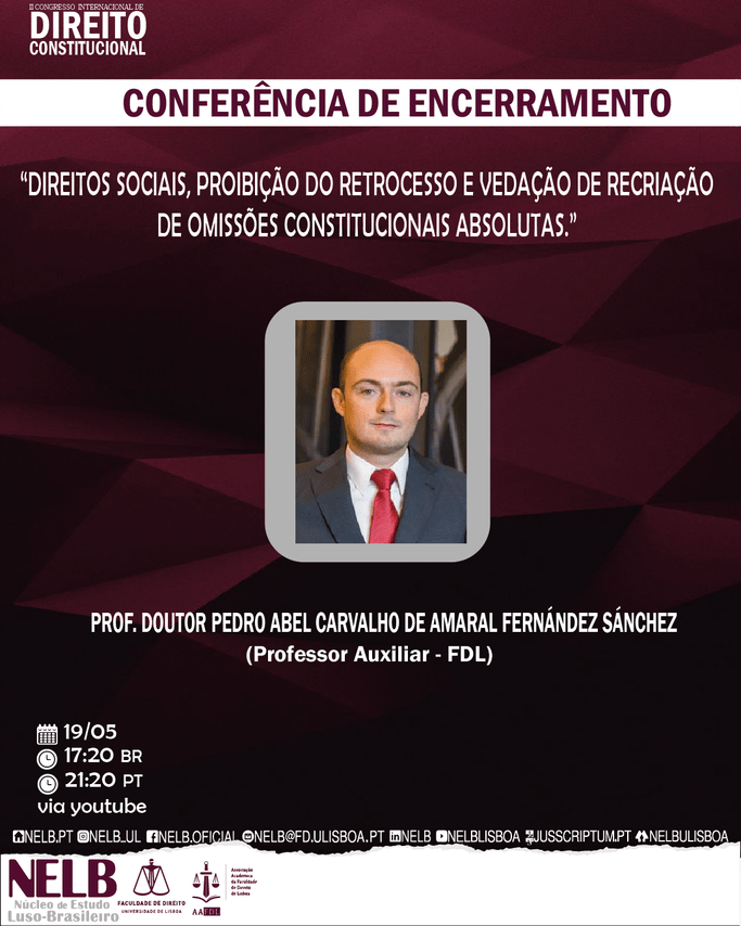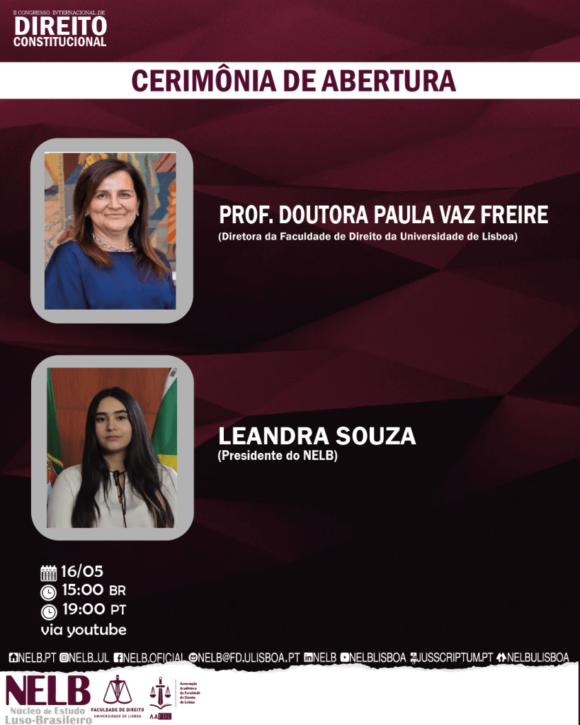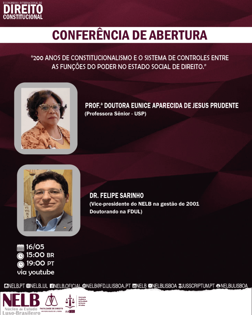 Dos dias 16 a 19 de maio de 2022, o Núcleo de Estudo Luso-Brasileiro da Universidade de Lisboa – NELB reúne grandes nomes do Constitucionalismo internacional, neste evento que se dedica a revisitar os temas que evocaram debates nos primeiros movimentos jurídico-constitucionalistas: soberania, representação política, formas de governo, poder moderador, liberalismo e direitos fundamentais.