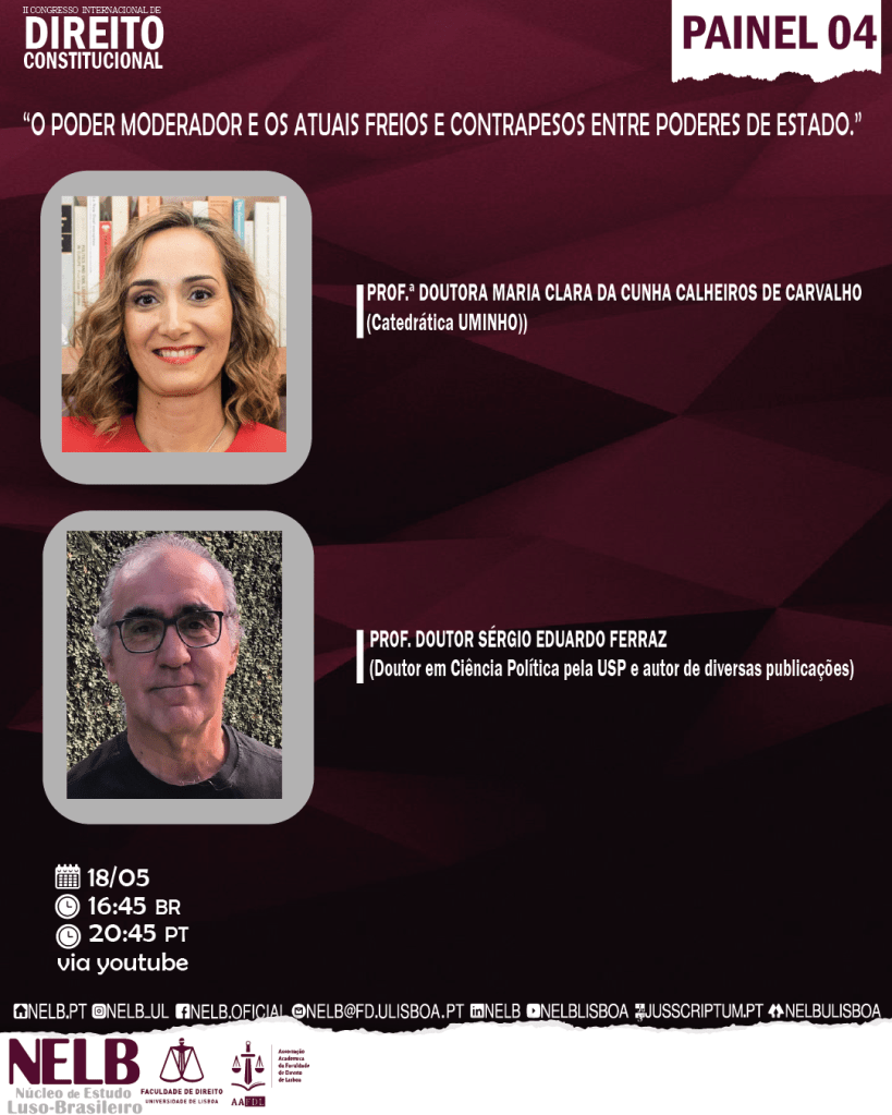 16h45 BR | 20h45 PT — Painel 4: “O Poder Moderador e os atuais freios e contrapesos entre Poderes de Estado.”