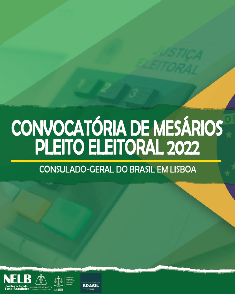 A Pedido do Consulado- Geral do Brasil em Lisboa, o NELB informa que o Consulado-Geral organizará, mais uma vez, as eleições presidenciais do Brasil em Lisboa. Para tanto, pedimos sua colaboração para a composição das mesas de votação, a qual será formalizada, oportunamente, por meio de intimação da Justiça Eleitoral.