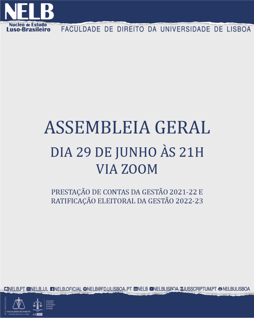 Que qualquer que que queira ou deva juntar documentos necessários à instrução da reunião que o faça via Secretaria da Mesa da Assembleia (assembleia@nelb.pt), até 48h antes da reunião. NELB – Núcleo de Estudo Luso-brasileiro Faculdade de Direito da Universidade de Lisboa, sala 10.08, Cidade Universitária, Alameda da Universidade, 1649-014, Lisboa – Portugal