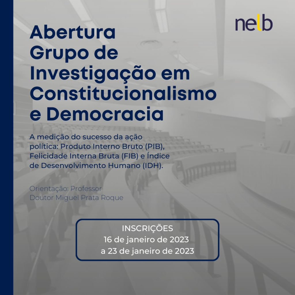 O Núcleo de Estudo Luso-Brasileiro – NELB, por meio da sua Direção Científica, no âmbito do Grupo de Investigação em Constitucionalismo e Democracia, pretende reunir alunos da Faculdade de Direito da Universidade de Lisboa e demais interessados(as) para um grupo de investigação sob a orientação do Professor Doutor Miguel Prata Roque, cujo tema é “A medição do sucesso da ação política: Produto Interno Bruto (PIB), Felicidade Interna Bruta (FIB) e Índice de Desenvolvimento Humano (IDH)”.