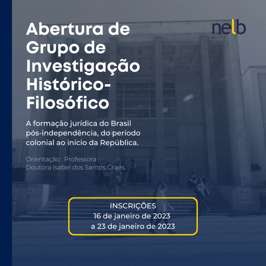 O Núcleo de Estudo Luso-Brasileiro – NELB, por meio da sua Direção Científica, no âmbito do Grupo de Investigação Histórico-Filosófico pretende reunir alunos da Faculdade de Direito da Universidade de Lisboa e demais interessados(as) para um grupo de investigação sob a orientação da Professora Doutora Isabel dos Santos Graes, cujo tema é “A formação jurídica do Brasil pós-independência, do período colonial ao início da República”.