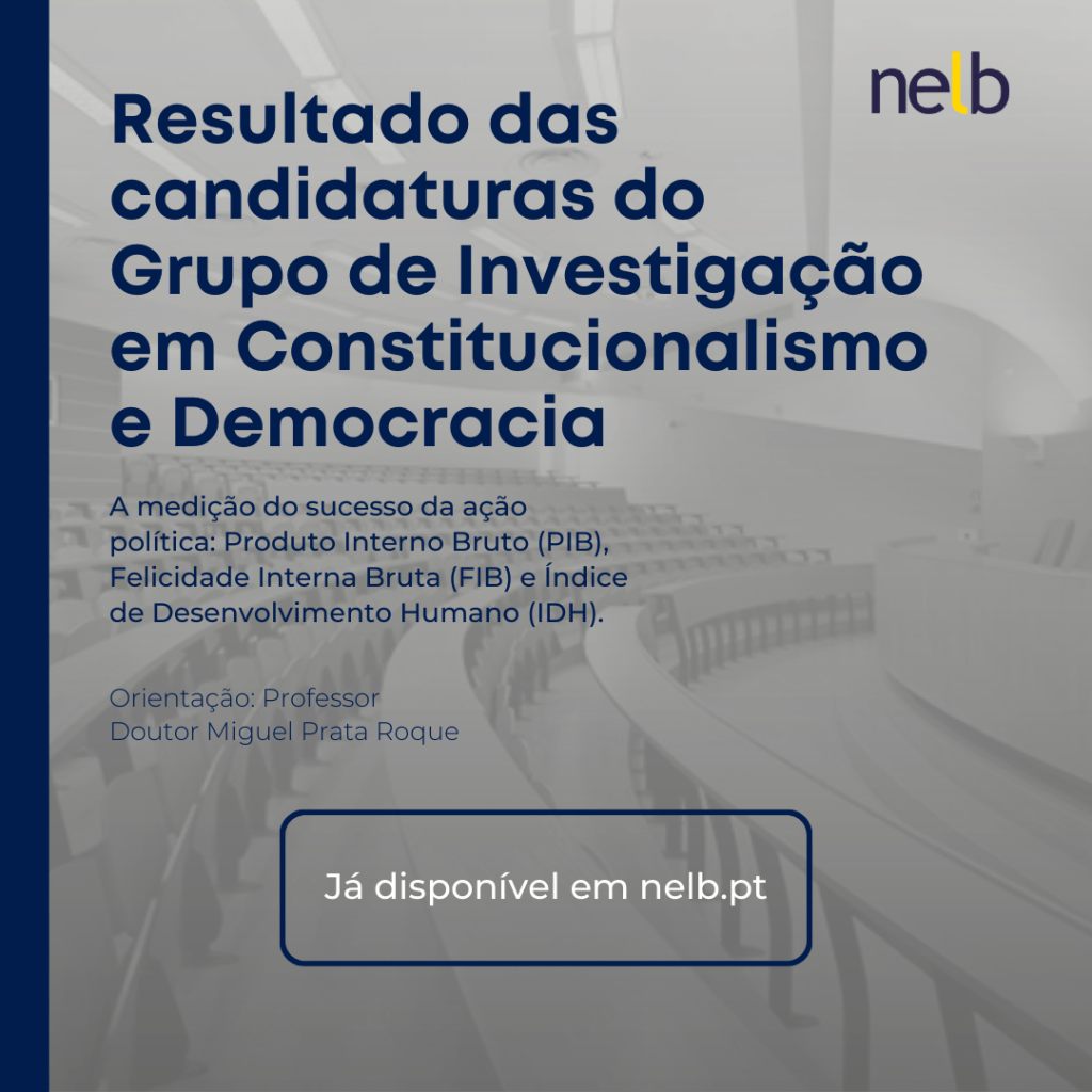 O Núcleo de Estudo Luso-Brasileiro – NELB, por meio da sua Direção Científica, no âmbito do Grupo de Investigação em Constitucionalismo e Democracia, divulga os resultados da seleção para o grupo de investigação sob a orientação do Professor Doutor Miguel Prata Roque, cujo tema é “A medição do sucesso da ação política: Produto Interno Bruto (PIB), Felicidade Interna Bruta (FIB) e Índice de Desenvolvimento Humano (IDH)”.