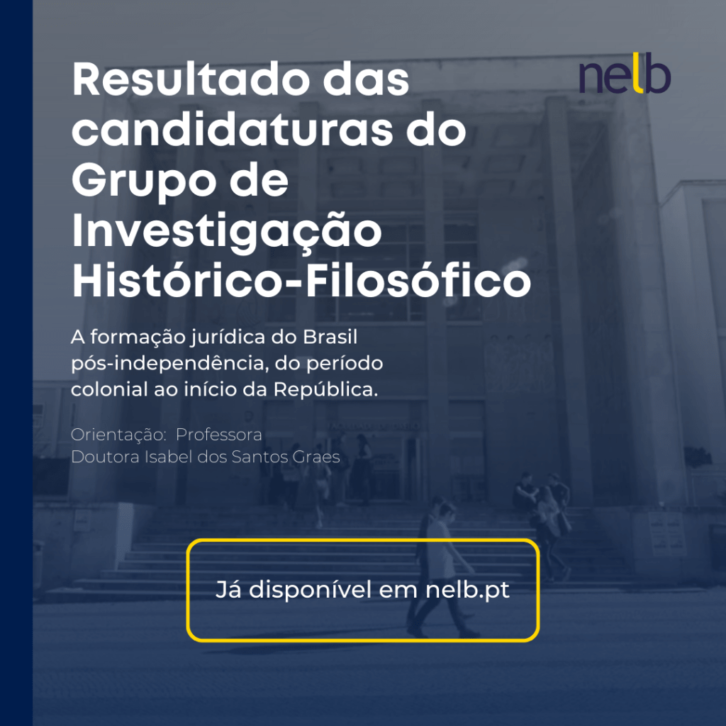 O Núcleo de Estudo Luso-Brasileiro – NELB, por meio da sua Direção Científica, no âmbito do Grupo de Investigação Histórico-Filosófico divulga os resultados da seleção para o grupo de investigação sob a orientação da Professora Doutora Isabel dos Santos Graes, cujo tema é “A formação jurídica do Brasil pós-independência, do período colonial ao início da República”.