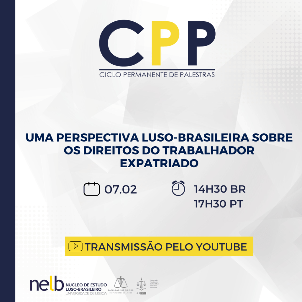 No dia 7 de fevereiro de 2023, o NELB – Núcleo de Estudo Luso-Brasileiro da Faculdade de Direito da Universidade de Lisboa, realizará mais uma edição do CPP- Ciclo Permanente de Palestras, tendo por tema a “Uma perspectiva luso-brasileira sobre os direitos do trabalhador expatriado”