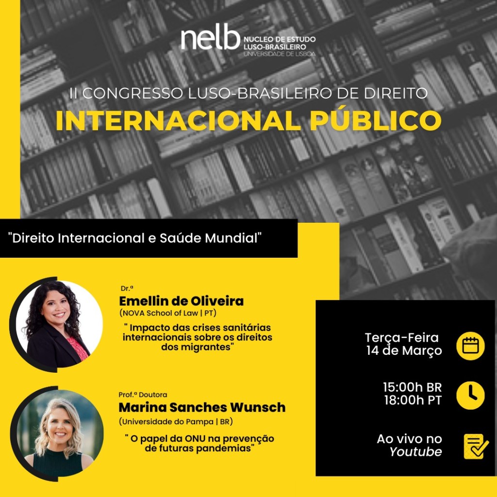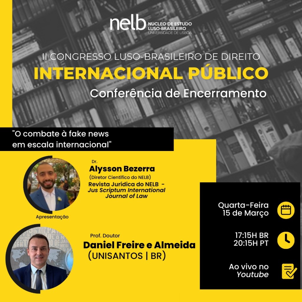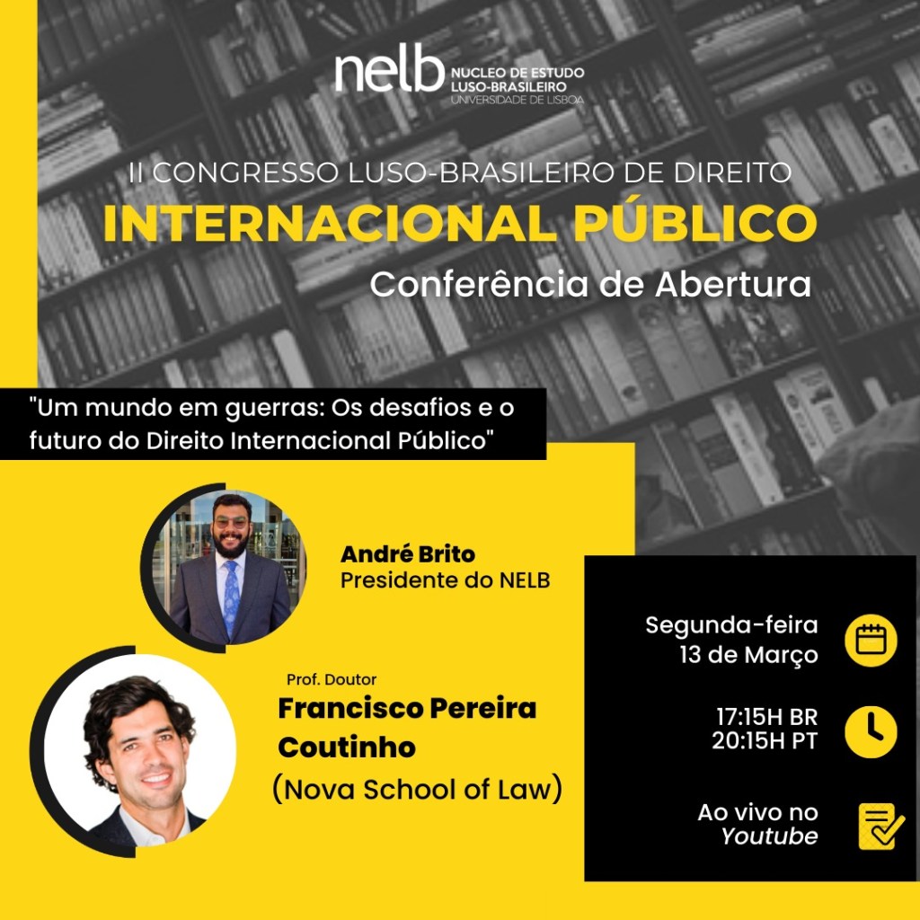 Nos dias 13, 14 e 15 de março de 2023, o NELB — Núcleo de Estudo Luso-Brasileiro, promoverá o II Congresso Luso-Brasileiro de Direito Internacional Público, com o tema “Os Novos Paradigmas do Direito Internacional Público”.