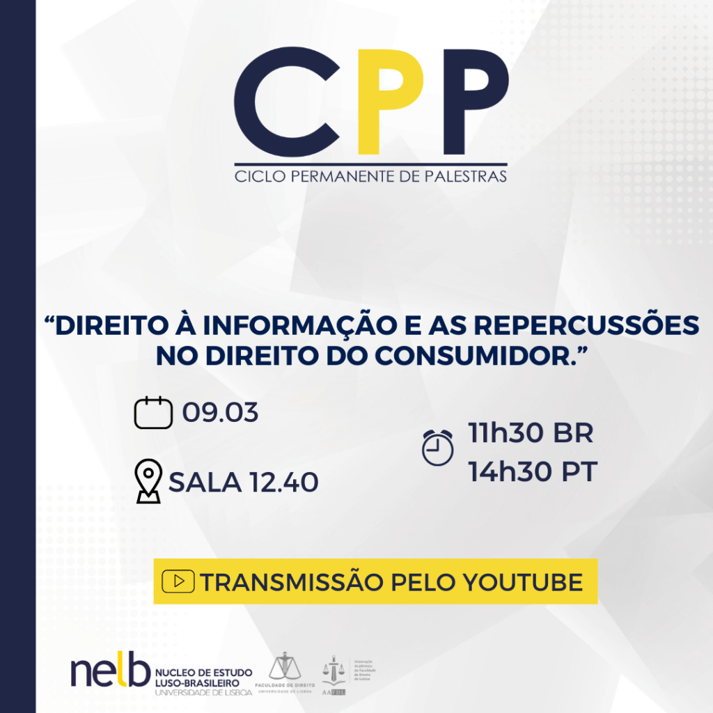 No dia 09 de março de 2023, o NELB – Núcleo de Estudo Luso-Brasileiro realizará mais uma edição do Ciclo Permanente de Palestras, tendo por tema “Direito à Informação e as Repercussões no Direito do Consumidor.”