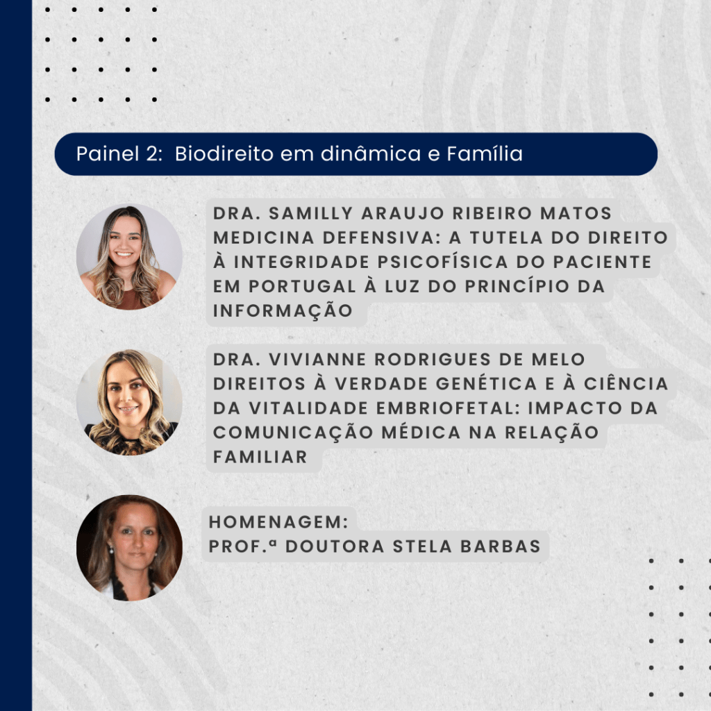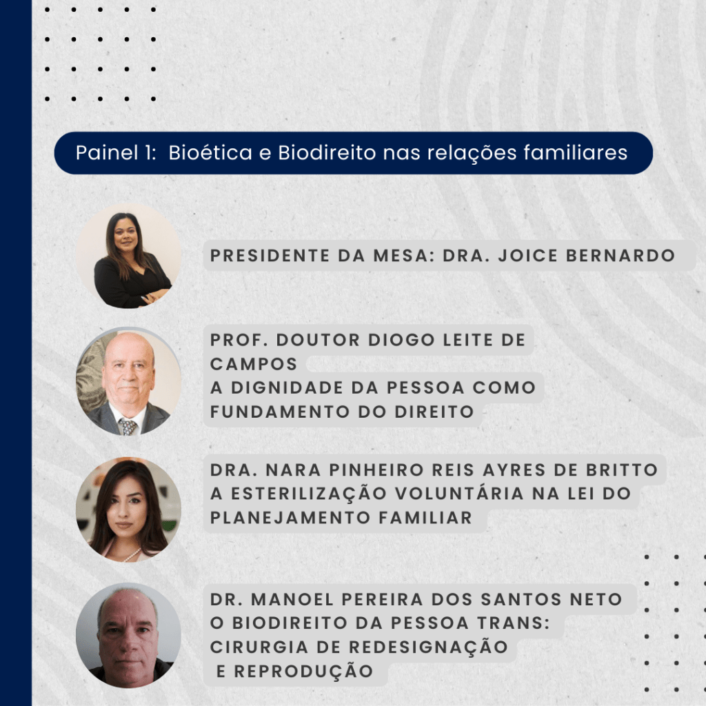 O Painel 1 irá abordar a Bioética e Biodireito nas relações familiares e contará com a intervenção do Professor Doutor Diogo Leite de Campos, da Dra. Nara Pinheiro Reis Ayres de Britto e do Dr. Manoel Pereira dos Santos Neto, com a Presidência da Mesa pela Dra. Joice Bernardo do Carmo.