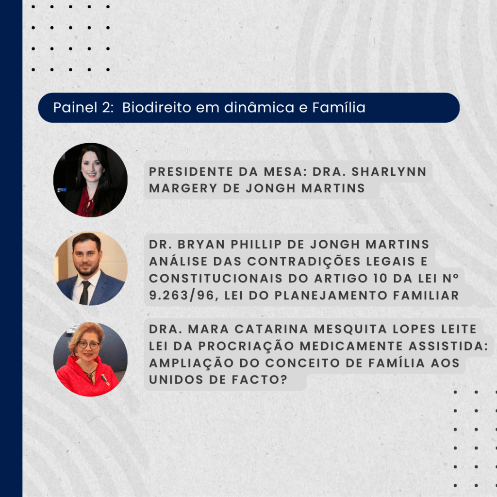 O Painel II irá abordar o Biodireito em dinâmica e Família, contará com as ilustres presenças do Dr. Bryan Phillip de Jongh Martins, Dra. Mara Catarina Mesquita Lopes Leite, Dra. Samilly Araujo Ribeiro Matos, Dra. Vivianne Rodrigues de Melo, com a Presidência da Mesa pela Dra. Sharlynn de Margery de Jongh Martins.