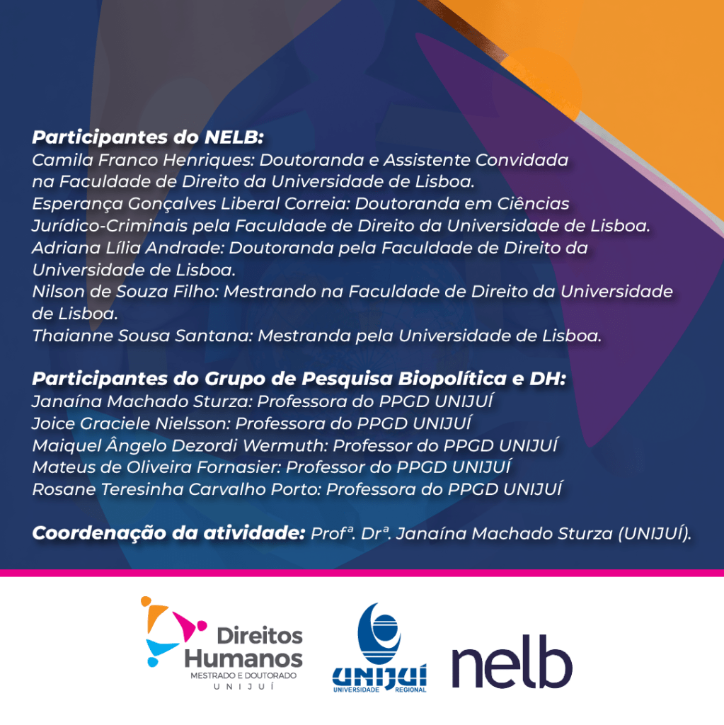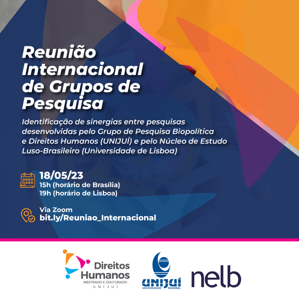 No dia 18 de maio, às 15h BR / 19h PT, sob coordenação científica da Professora Doutora Janaína Machado Sturza, o NELB e a UNIJUÍ organização uma Reunião Internacional de Grupos de Pesquisa para identificar as sinergias entre os pesquisas desenvolvidas pelo grupo de pesquisa “Biopolítica e Direitos Humanos” (PPGD-UNIJUÍ) e pelo Núcleo.