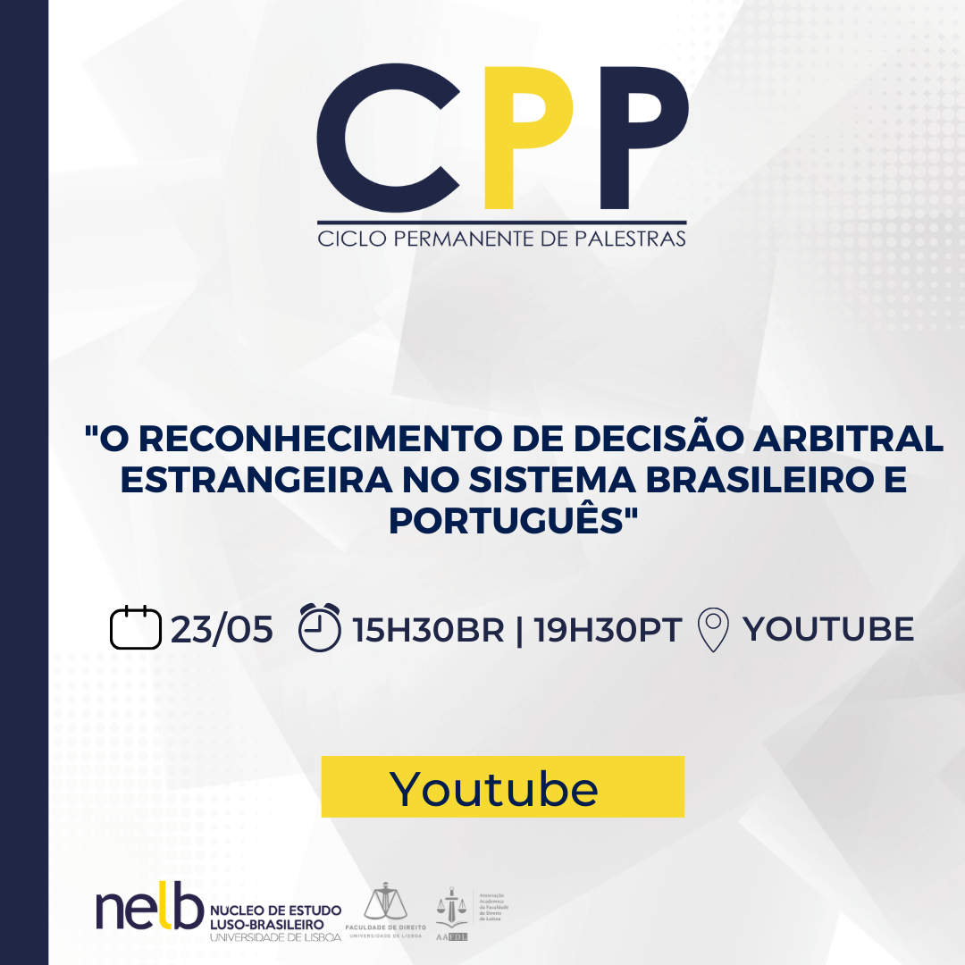 No dia 23 de maio de 2023, o NELB – Núcleo de Estudo Luso-Brasileiro da Faculdade de Direito da Universidade de Lisboa, realizará mais uma edição do CPP- Ciclo Permanente de Palestras, tendo por tema o “O Reconhecimento de decisão arbitral estrangeira no sistema Brasileiro e Português”