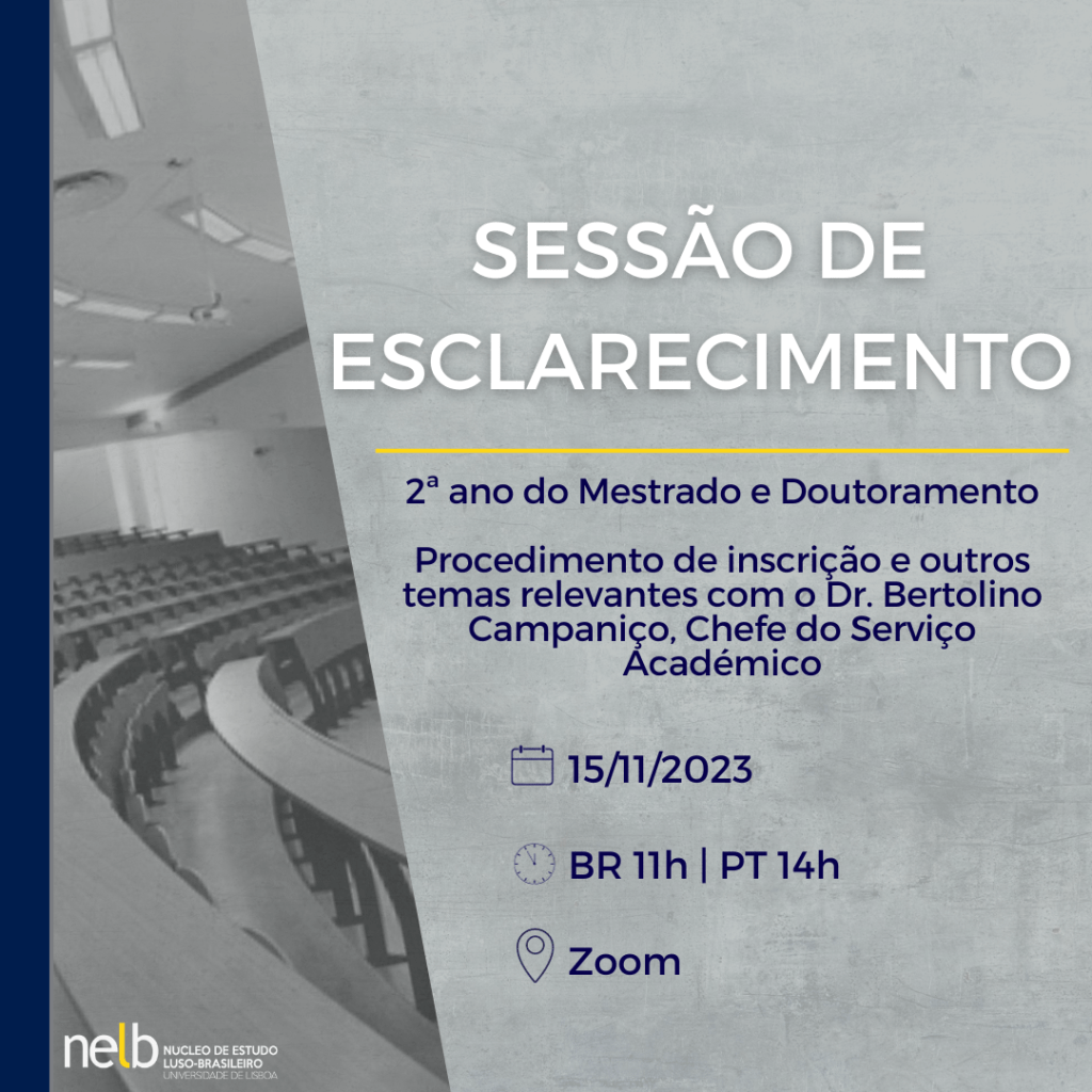 No dia 15 de novembro de 2023, às 11h (hora de Brasília), 14h (hora de Lisboa), através do Zoom, o NELB – Núcleo de Estudo Luso Brasileiro da Faculdade realizará uma sessão de esclarecimento tendo em conta a abertura do 2.º ano curricular do Mestrado em Direito e Ciência Jurídica e do Doutoramento do ano letivo de 2022/2023.