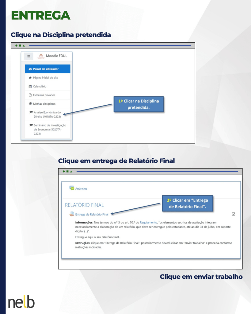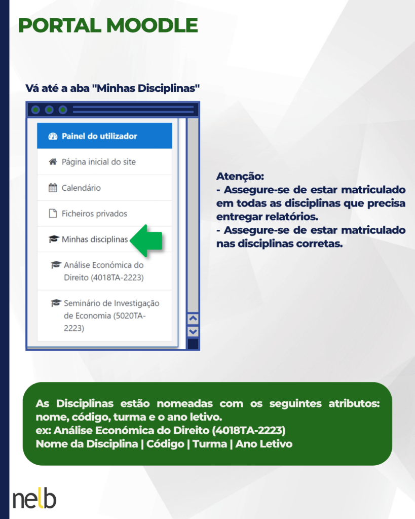 Pensando em otimizar e simplificar o processo de entrega dos vossos trabalhos finais, o Núcleo de Estudo Luso-Brasileiro (NELB) tem o prazer de lançar o Guia Rápido de Entrega dos Relatórios 2024/25. Esta iniciativa foi desenvolvida para ser uma ferramenta prática e acessível, que vos irá auxiliar em cada etapa, garantindo que não percam nenhum detalhe importante.