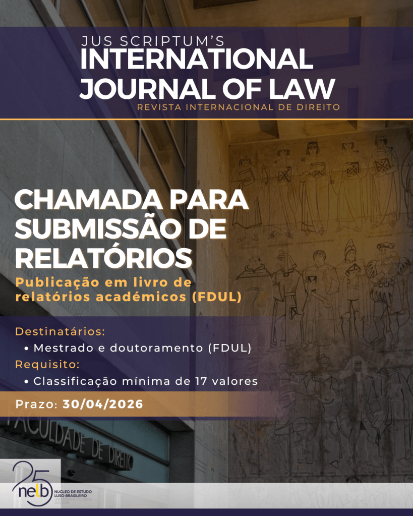 Encontra-se aberta a chamada para submissão de relatórios académicos da Faculdade de Direito da Universidade de Lisboa ao livro de relatórios da Jus Scriptum’s International Journal of Law. A presente chamada destina-se exclusivamente a relatórios aprovados em unidades curriculares de Mestrado Científico e Doutoramento da FDUL, nos termos do Edital n.º 01/2026.